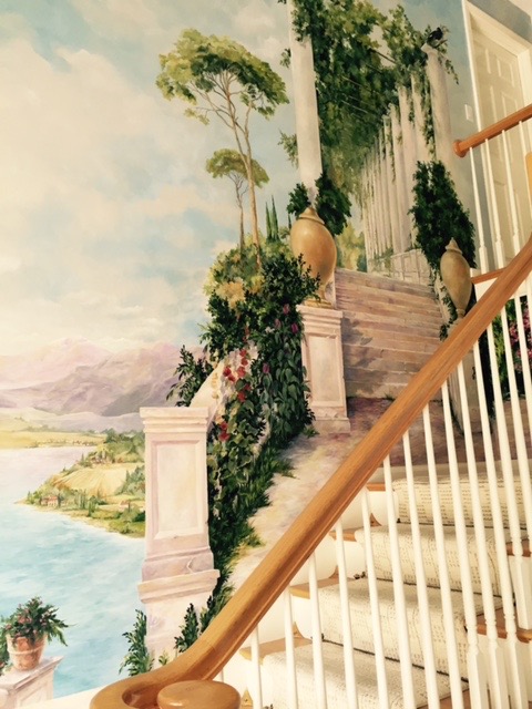 Rosalie found two Italian sisters to paint a mural in our foyer. The lead artist did paint scenery for broadway shows, both in NY and in Boston. Rosalie selected a painting of Lake Como in Italy. She also selected a drawing of the Goddess Diana for one of the walls.The artist did her best to portray Rosalie in the mural as Diana, the Huntress. It wasn’t a bad portrayal of Rosalie when she was healthy. The painting of Lake Como depicts several homes along the waterfront. Rosalie would tell guests that one of the houses belonged to George Cooney, and the one next to it, was ours. A few actually believed her and asked more questions. Yes, Rosalie did have a sense of humor.